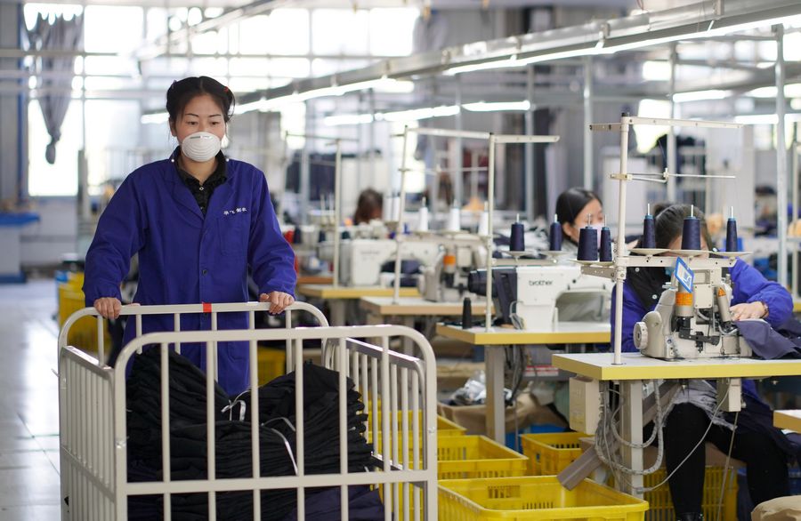 Workers are busy at the garment workshop of a foreign trade company in Neiqiu County of Xingtai City, north China's Hebei Province, March 4, 2020. Foreign trade enterprises in Neiqiu County have resumed production in an orderly way during the fight against the novel coronavirus epidemic. (Xinhua/Zhu Xudong)