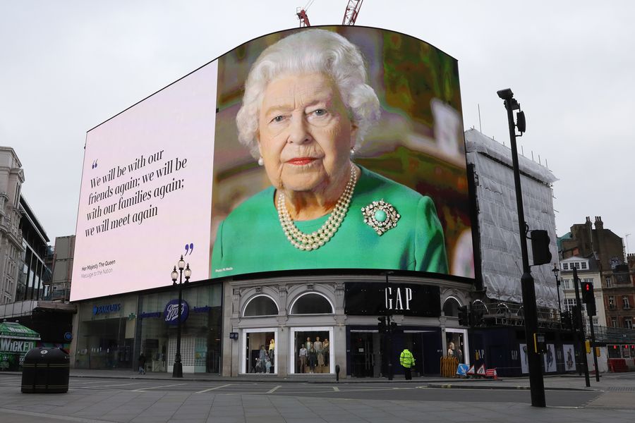 A screen shows British Queen Elizabeth II and a quote from her speech on the fight against COVID-19 at Piccadilly Circus in London, Britain, April 13, 2020.(Photo by Tim Ireland/Xinhua)