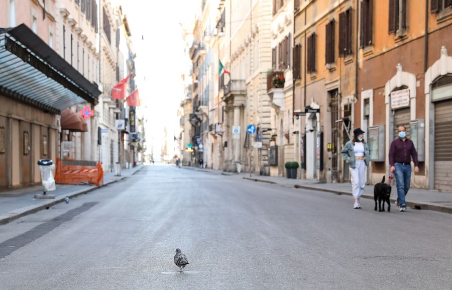 People wearing face masks walk on a street in Rome, Italy, April 11, 2020. (Xinhua/Cheng Tingting)