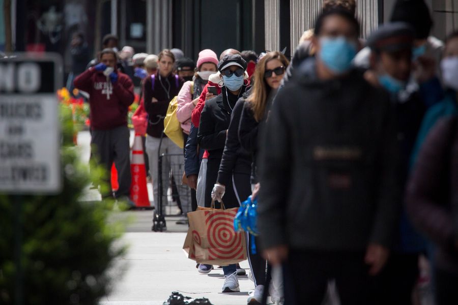 People wearing face masks wait in line to do shopping at a store during the coronavirus pandemic in the Brooklyn borough of New York, the United States, on April 14, 2020. (Photo by Michael Nagle/Xinhua)