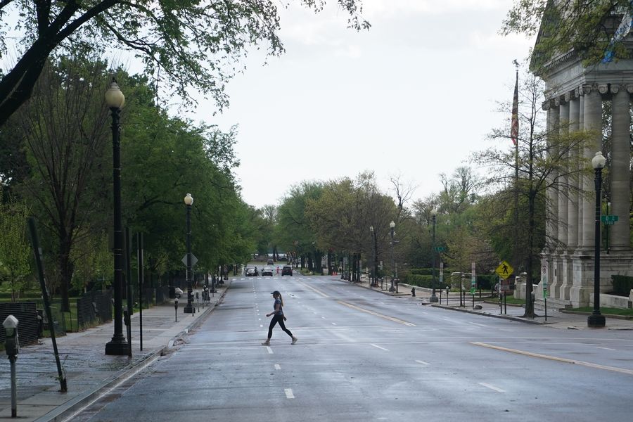 A woman crosses an empty street in Washington D.C., the United States, April 13, 2020. (Xinhua/Liu Jie)