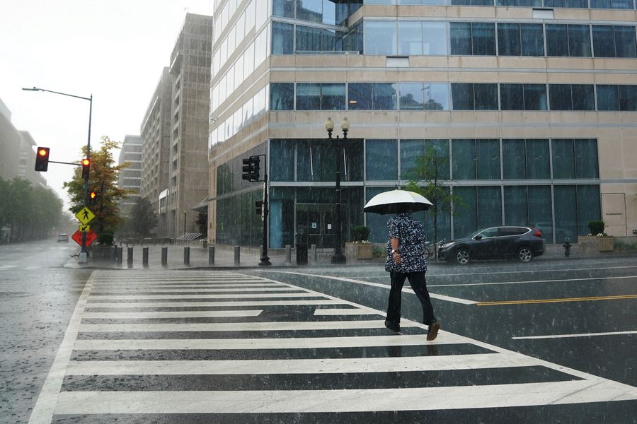 A man crosses a road in the rain near the International Monetary Fund (IMF) Headquarters in Washington D.C., the United States, April 13, 2020. (Xinhua/Liu Jie)
