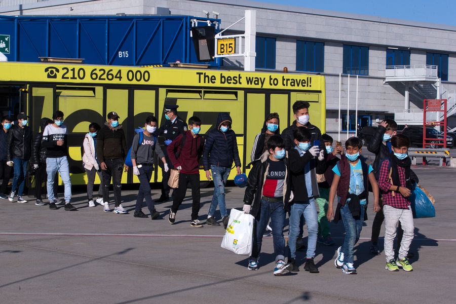 A group of refugee children from the reception camps of the Aegean islands leave a shuttle bus to board an airplane to Germany, in Athens, Greece, on April 18, 2020.(Xinhua/Marios Lolos)