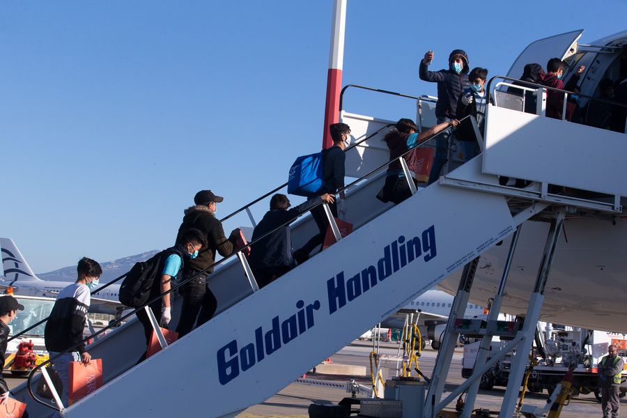 A group of refugee children from the reception camps of the Aegean islands board an airplane to Germany, in Athens, Greece, on April 18, 2020.(Xinhua/Marios Lolos)