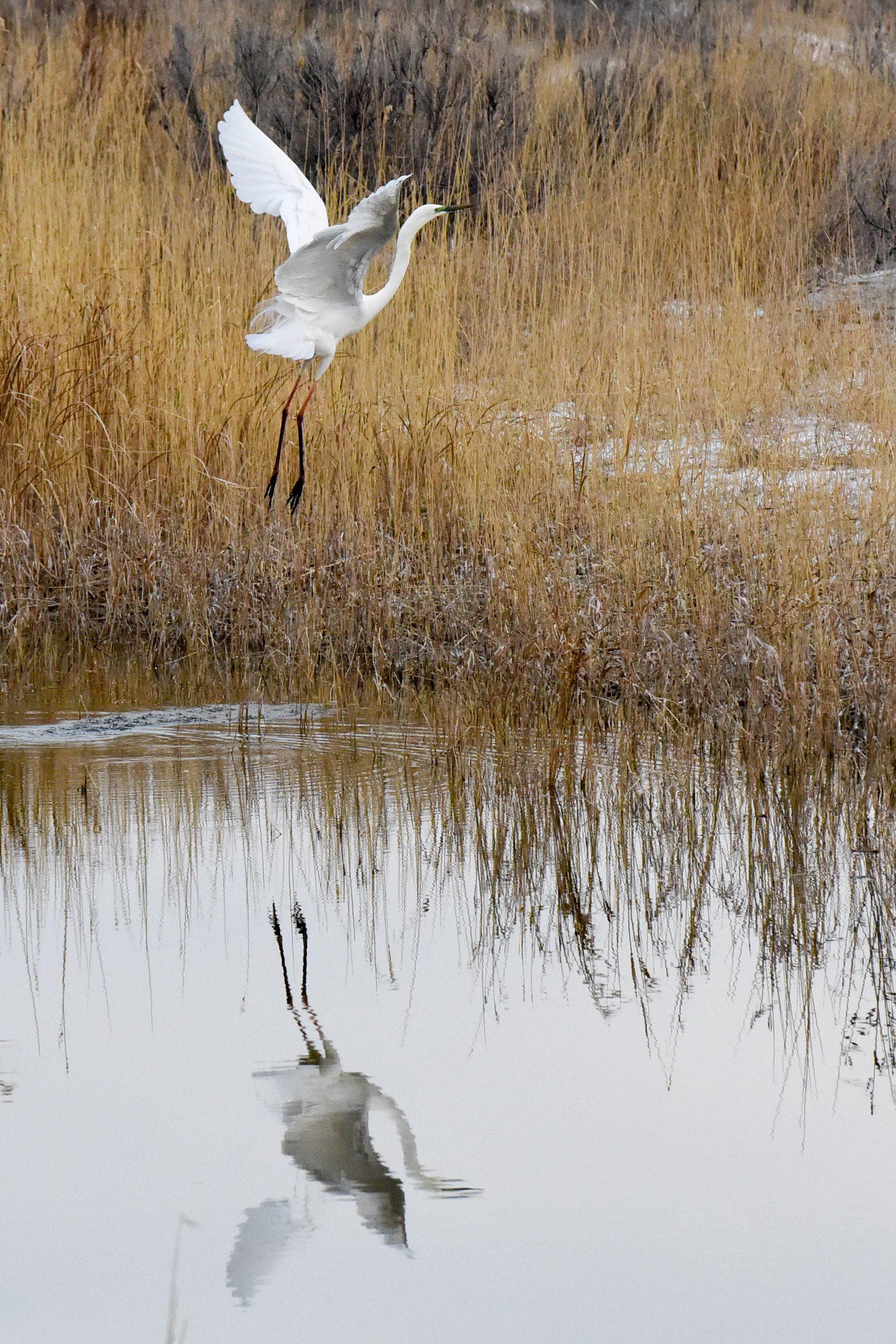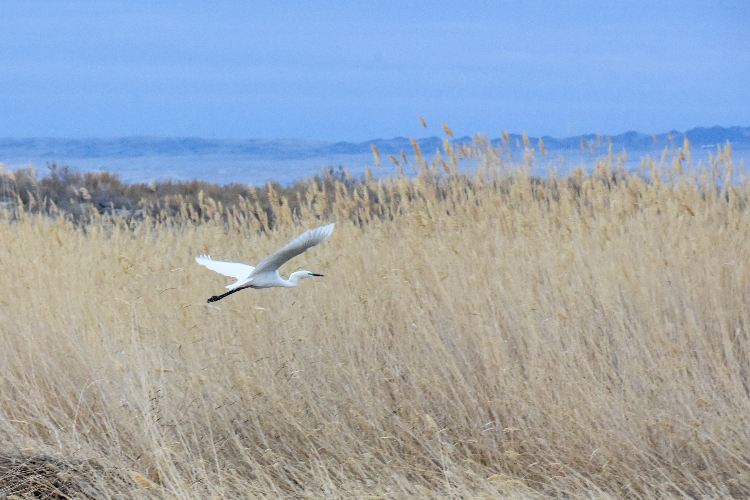 An egret flies at Ulungur Lake National Wetland Park, April 17, 2020. (Xinhua/Ding Lei)