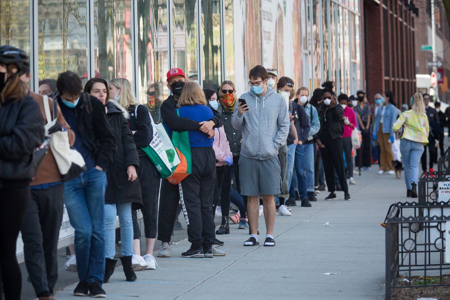 People wearing face masks wait in line to do shopping at a Whole Foods store during the coronavirus pandemic in the Brooklyn borough of New York, the United States, on April 14, 2020. (Photo by Michael Nagle/Xinhua)