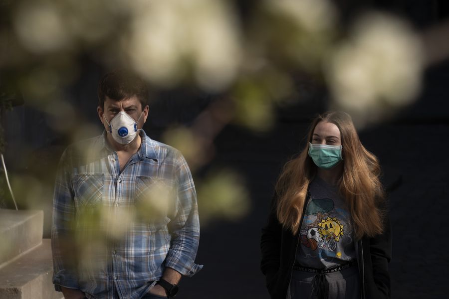 Pedestrians wearing face masks walk in the old town of Warsaw, Poland on April 20, 2020. (Photo by Jaap Arriens/Xinhua)