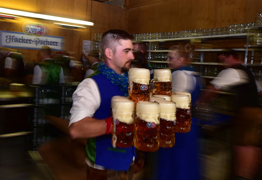 File photo shows that a staff member serves beer during the first day of the Oktoberfest 2019 in Munich, Germany, Sept. 21, 2019. (Xinhua/Lu Yang)