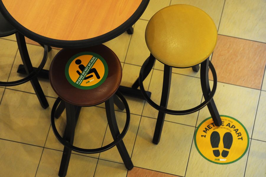 Photo taken on April 3, 2020 shows social distancing markers in a shopping mall in Singapore's Bugis area. (Photo by Then Chih Wey/Xinhua)
