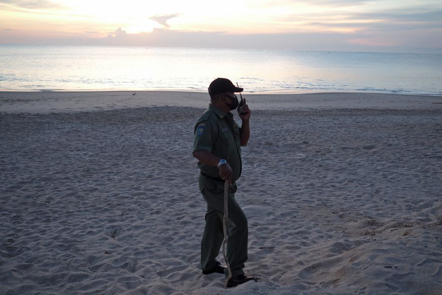 An official stands guard on a beach in Bali, Indonesia, April 20, 2020. (Photo by Moonstar Simanjuntak/Xinhua)