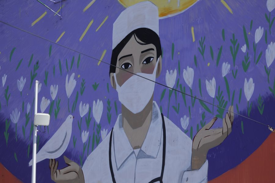 Photo taken on April 19, 2020 shows a painting of a female doctor on a facade of a residential complex in Nur-Sultan, Kazakhstan. (Photo by Kalizhan Ospanov/Xinhua)