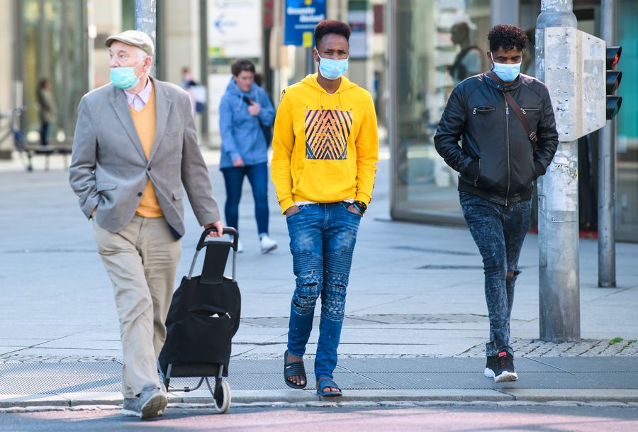 Pedestrians wearing face masks are seen in Dresden of Saxony state, eastern Germany, on April 20, 2020. (Photo by Kevin Voigt/Xinhua)