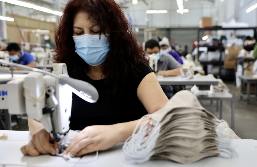 A worker makes face masks at a face mask factory transformed from a 16,000 square-foot apron factory amid the COVID-19 pandemic in the City of Vernon, Los Angeles County, California, the United States, April 16, 2020. (Xinhua)