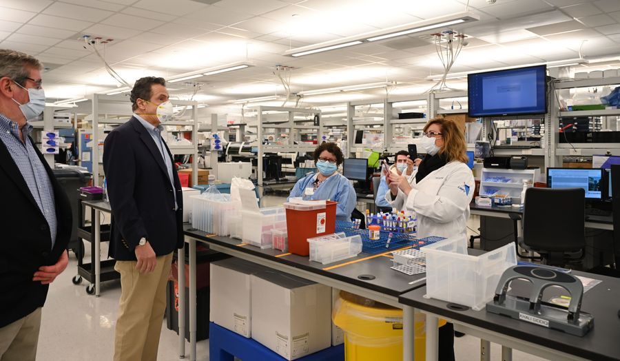 New York Governor Andrew Cuomo (2nd L) tours the Northwell Health Core Lab in New Hyde Park before delivering his daily COVID-19 briefing in New York, the United States, April 19, 2020. (Kevin P. Coughlin/Office of Governor Andrew M. Cuomo/Handout via Xinhua)