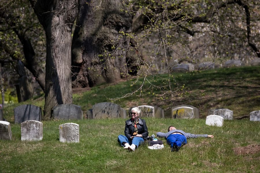 People are seen on the grass beside graves in Green-Wood Cemetery in the Brooklyn borough of New York, the United States, April 19, 2020. (Photo by Michael Nagle/Xinhua)