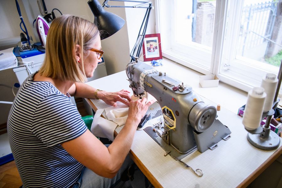 Christine makes face masks at her tailor shop in southern German city Traunstein, April 25, 2020. (Photo by Kevin Voigt/Xinhua)