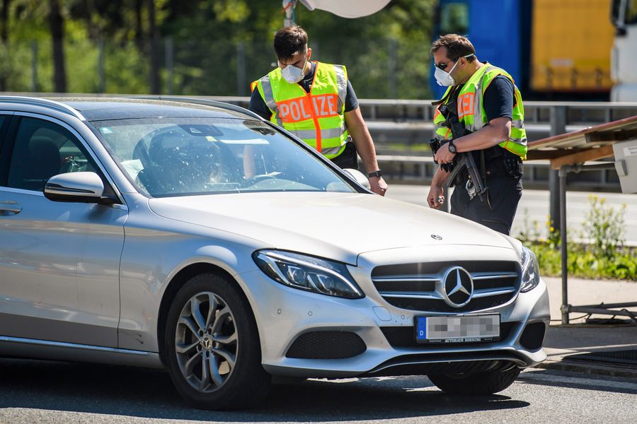 Policemen wearing face masks check a vehicle at a checkpoint on the border between Germany and Austria in Bad Reichenhall, southern Germany, on April 23, 2020. (Photo by Kevin Voigt/Xinhua)