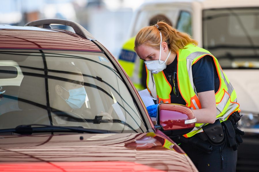 A Policewoman wearing a face mask checks a vehicle at a checkpoint on the border between Germany and Austria in Bad Reichenhall, southern Germany, on April 23, 2020. (Photo by Kevin Voigt/Xinhua)■
