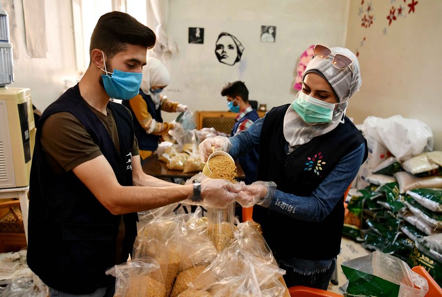 Volunteers pack food for later distribution in Damascus, capital of Syria, on April 29, 2020. (Xinhua/Ammar Safarjalani)