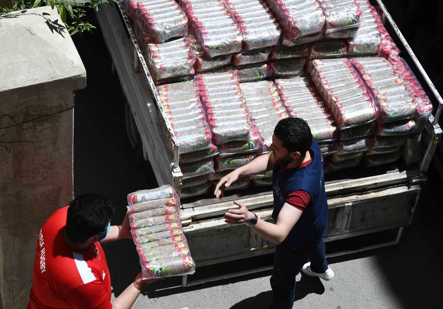 Volunteers transport food items in Damascus, capital of Syria, on April 28, 2020. (Xinhua/Ammar Safarjalani)