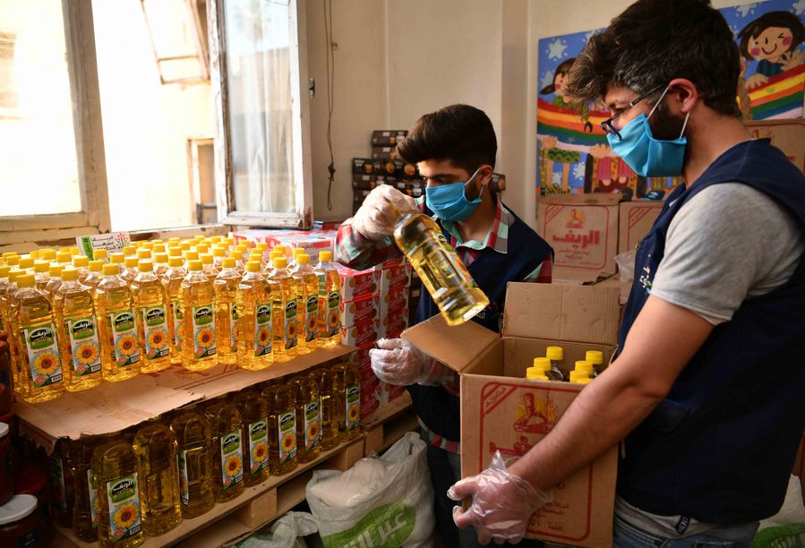 Volunteers pack bottles of oil for later distribution in Damascus, capital of Syria, on April 29, 2020.(Xinhua/Ammar Safarjalani)