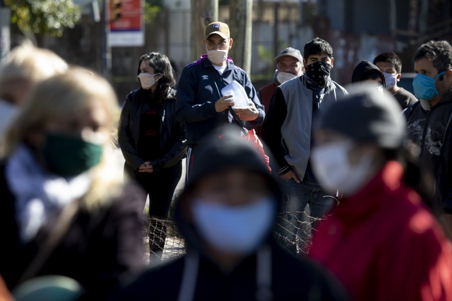 People wait in a row for the delivery of food rations in a community canteen in the town of La Matanza, Argentina, on April 29, 2020. (Xinhua/Martin Zabala)