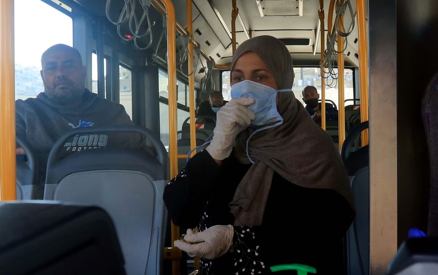 People ride a bus in Amman, Jordan, on April 29, 2020. (Photo by Mohammad Abu Ghosh/Xinhua)
