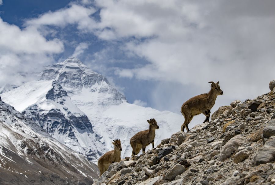 Blue sheep are seen in Mount Qomolangma National Nature Reserve in southwest China's Tibet Autonomous Region, April 29, 2020. (Xinhua/Purbu Zhaxi)