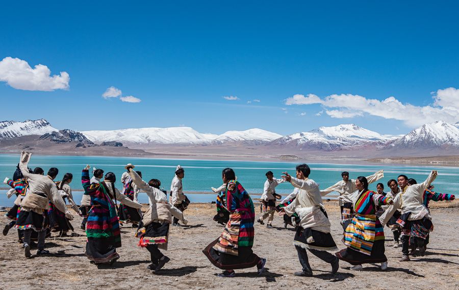 People dance by Tangqung Co Lake in Nagqu, southwest China's Tibet Autonomous Region, April 30, 2020. (Xinhua/Hou Jie)