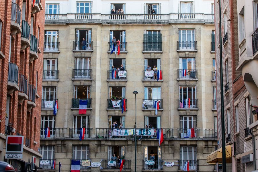 People applaud for medical workers on a residential building in Saint-Mande, near Paris, France, May 2, 2020. (Photo by Aurelien Morissard/Xinhua)