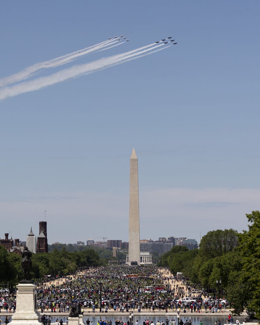 A formation of the Thunderbirds and Blue Angels fly over the National Mall in Washington D.C., the United States, May 2, 2020. The U.S. Navy's Blue Angels and U.S. Air Force's Thunderbirds honored frontline COVID-19 responders and essential workers with formation flights over here on Saturday. (Photo by Ting Shen/Xinhua)