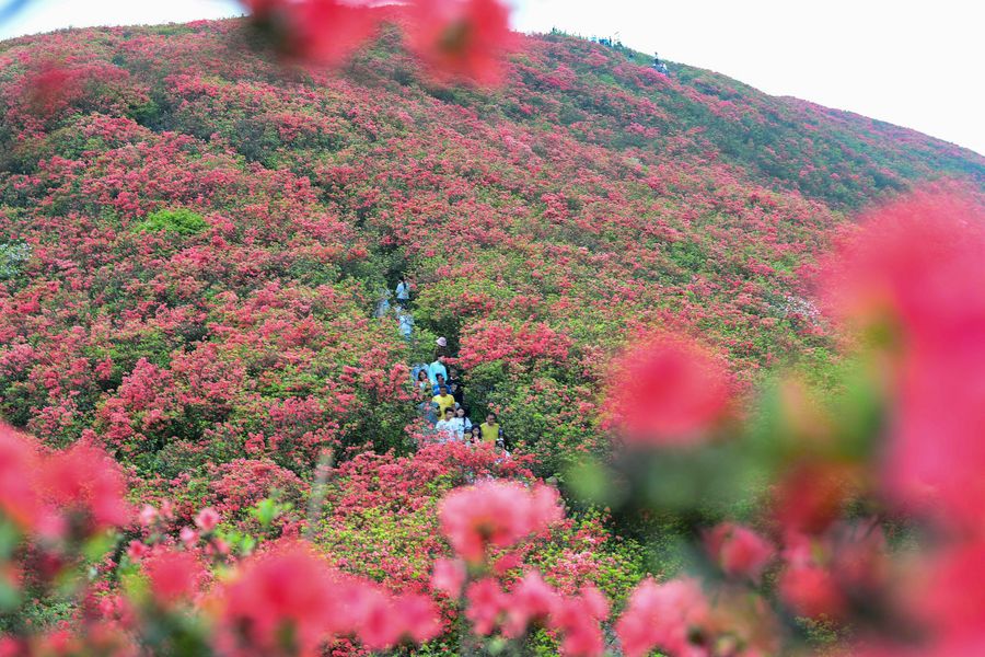 People view blooming azalea at Longquan Mountain scenic spot in Danzhai County, southwest China's Guizhou Province, May 2, 2020. (Xinhua/Yang Ying)