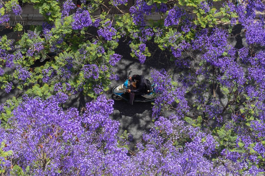 Photo taken on May 2, 2020 shows blossoming jacaranda trees along a street in Kunming City, southwest China's Yunnan Province. (Xinhua/Lin Yiguang)