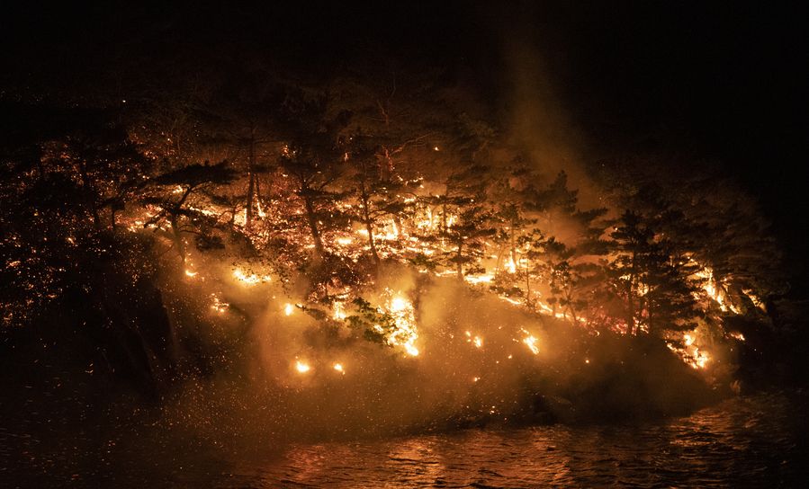 Photo taken on early May 2, 2020 shows a fire in Goseong, Gangwon Province, South Korea. A fire broke out late Friday in Goseong, Gangwon Province, forcing hundreds of people to evacuate. The fire has been mostly extinguished by Saturday noon, with no reports of casualties. (Photo by Lee Sang-ho/Xinhua)