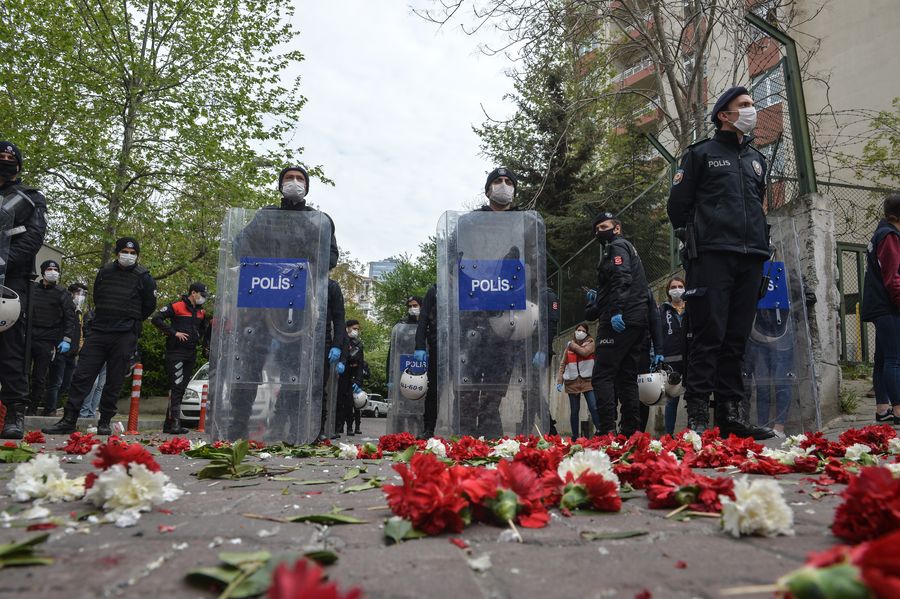 Police officers wearing face masks block a road in Istanbul, Turkey, May 1, 2020. Turkish police on Friday detained at least 38 people who intended to stage several unauthorized marches to central Istanbul to mark the International Workers' Day, local media reported. (Photo by Mustafa Kaya/Xinhua)