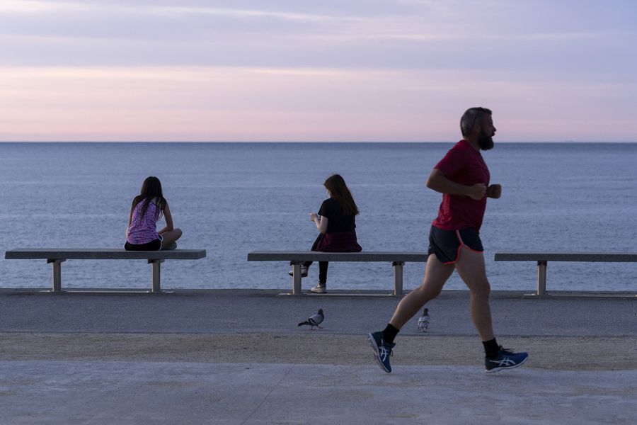 Two women maintain social distance while a runner passes by in Barcelona, Spain, May 2, 2020. The Spanish government set time slots for outdoor activities, in line with social-distancing regulations, to prevent further contagion from COVID-19. (Photo by Joan Gosa/Xinhua)
