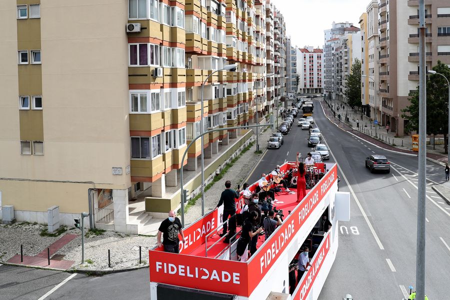 Portuguese fado singer Cuca Roseta performs at a live concert on top of a vehicle running through streets in Lisbon, Portugal, May 1, 2020, amid the COVID-19 pandemic. (Photo by Pedro Fiuza/Xinhua)