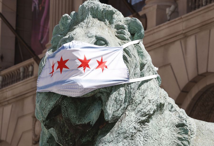 Photo taken on May 1, 2020 shows a lion statue with a mask in front of the Art Institute of Chicago in Chicago, Illinois, the United States. (Photo by Joel Lerner/Xinhua)