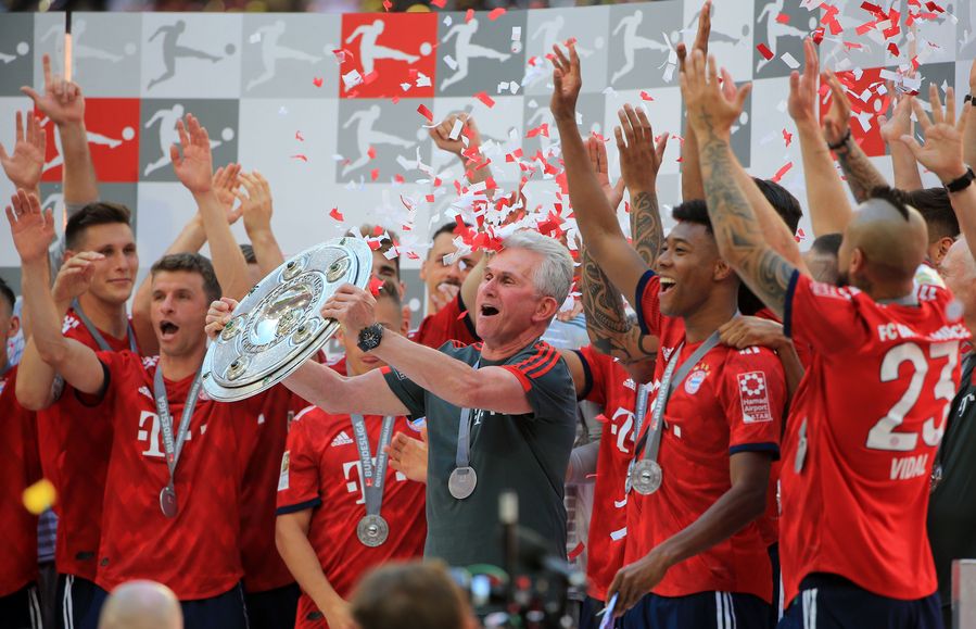 Bayern Munich head coach Jupp Heynckes (Front C) holds the German Bundesliga trophy after winning the match against VfB Stuttgart, in Munich, Germany, on May 12, 2018. (Xinhua/Philippe Ruiz)