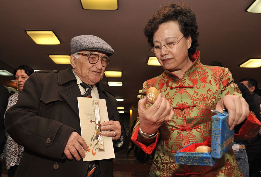 File photo shows Chinese artist Zhao Wei (R) shows a painted eggshell to an Albanian man during Beijing's Intangible Cultural Heritage Exhibition in Tirana, capital of Albania, March 18, 2012. (Xinhua/Wu Wei)