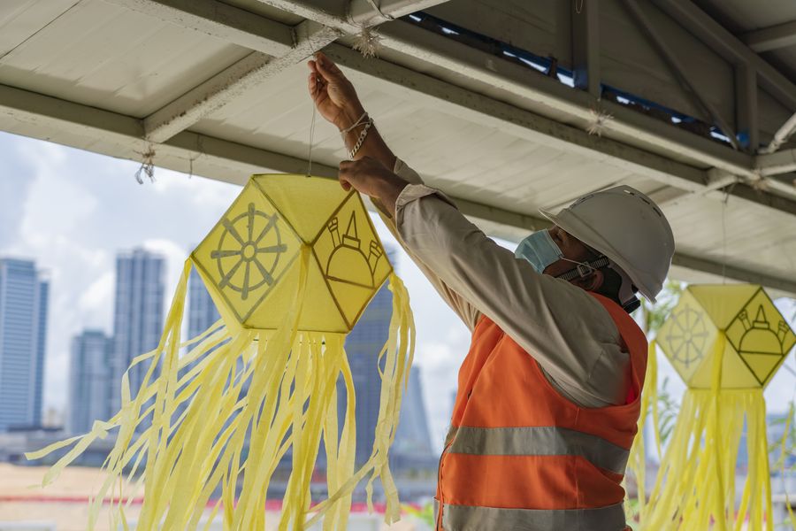 A local employee video calls his family on Vesak festival in Colombo Port City, Sri Lanka, May 7, 2020. (Photo by Peng Bo/Xinhua)