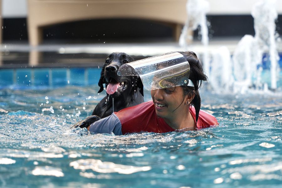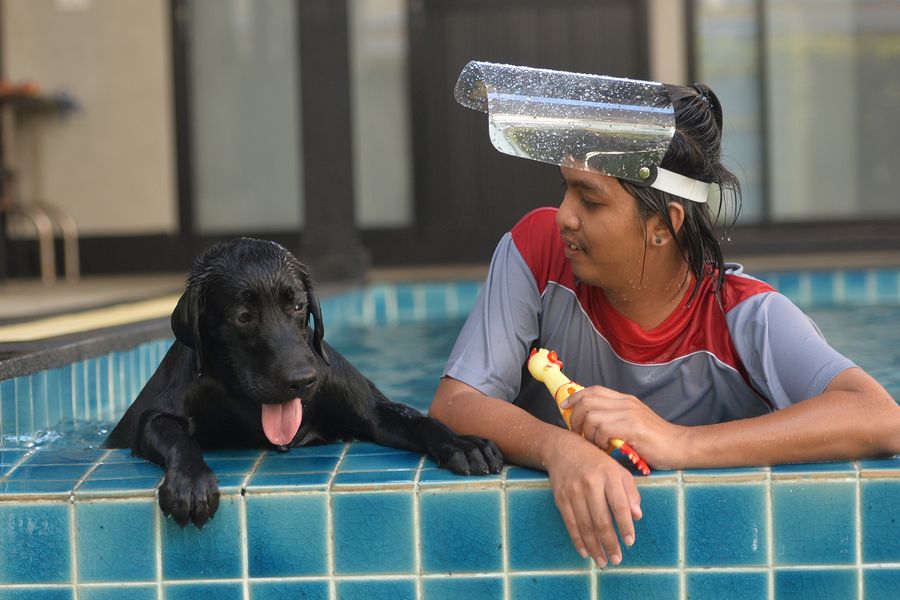 A dog swims in a pet pool with a staff in Bangkok, Thailand, May 8, 2020.(Xinhua/Rachen Sageamsak)■