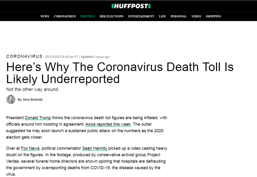 "Far from being exaggerated, experts believe the true number of people who have died from COVID-19 is actually higher than what's been reported," said a HuffPost report on Sunday.