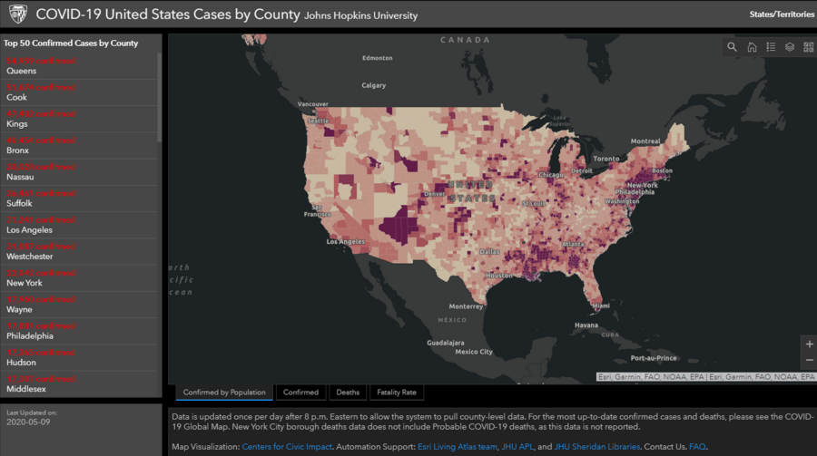 Screenshot of the COVID-19 map created by the Johns Hopkins University shows the latest figures of the confirmed cases in the United States, updated on May 9, 2020.