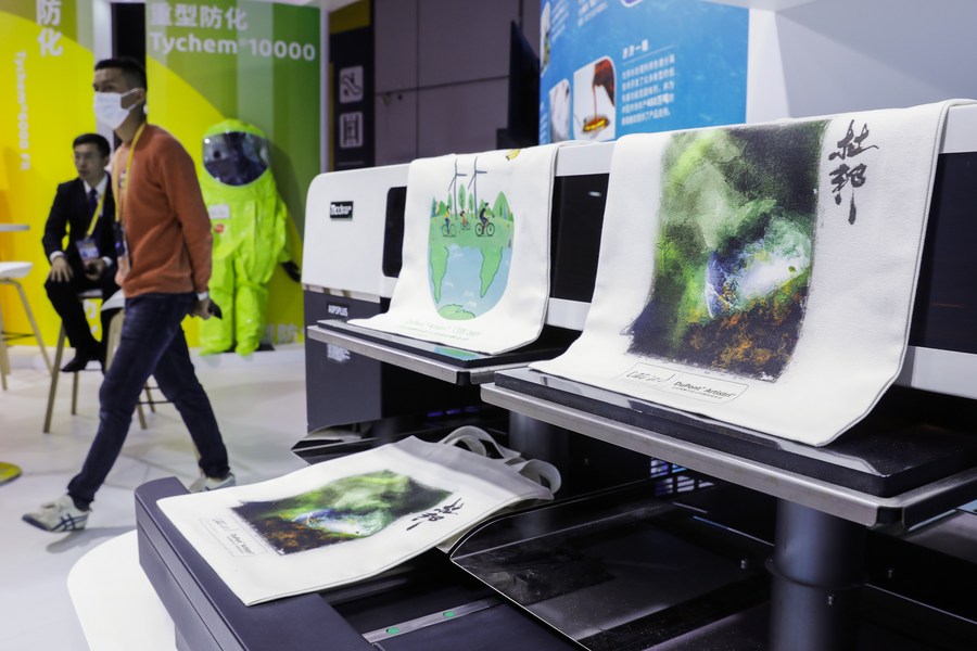 Photo taken on Nov. 5, 2021 shows handbags printed with environmental friendly ink at DuPont booth during the 4th China International Import Expo (CIIE) in east China's Shanghai. (Xinhua/Zhang Yuwei)