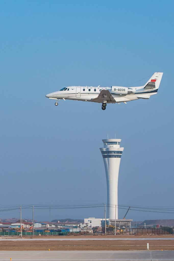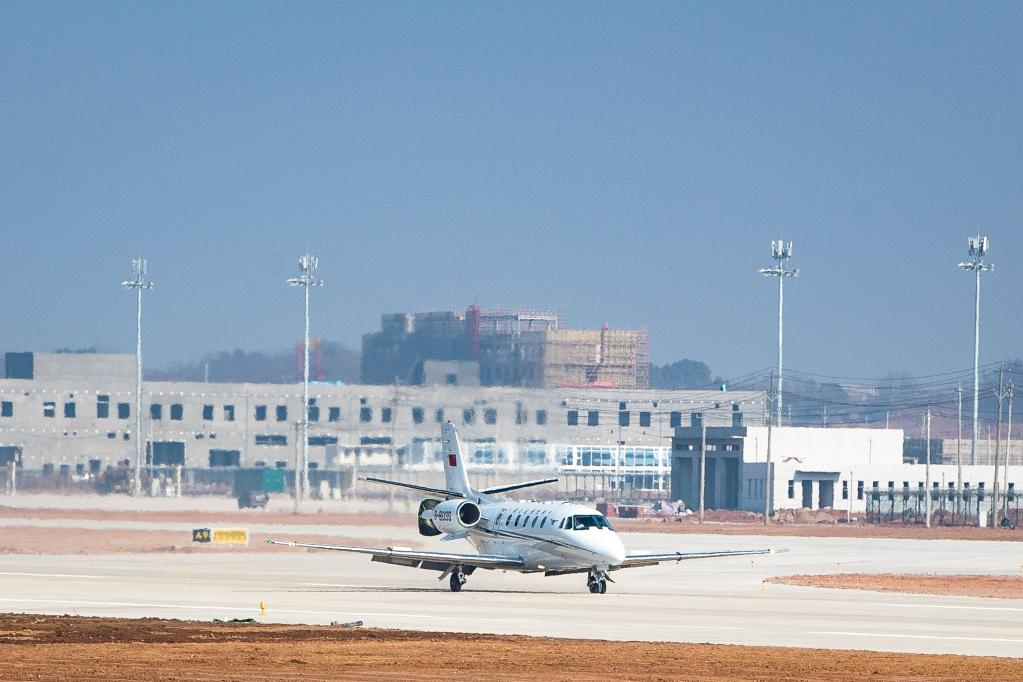 A Cessna 560 airplane lands at the Ezhou Huahu Airport in Ezhou, central China's Hubei Province, Dec. 29, 2021. A Cessna 560 carried out flight verification of the Ezhou Huahu Airport on Wednesday, marking the completion of the cargo-oriented airport. The airport is the country's first cargo airport, with the functional orientation of the air cargo hub and feeder airport for passenger transport. It is also China's first airport project that introduces social capital and enterprises. (Xinhua/Xiao Yijiu)