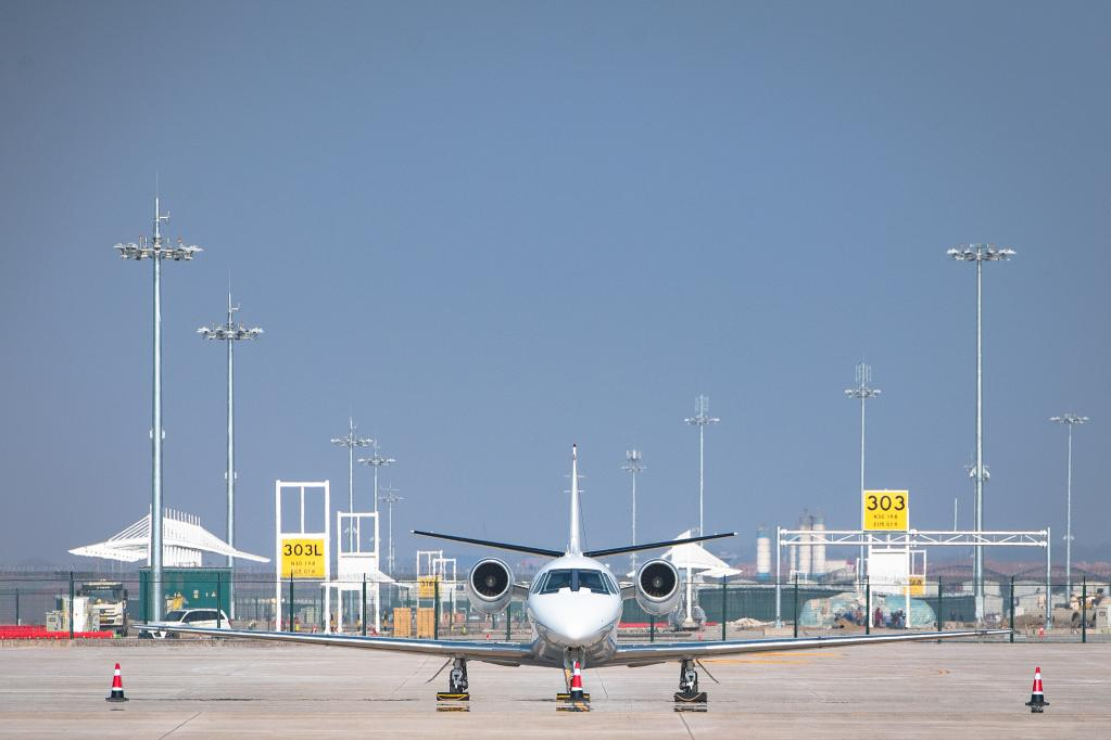 A Cessna 560 airplane is parked at the apron of the Ezhou Huahu Airport in Ezhou, central China's Hubei Province, Dec. 29, 2021. A Cessna 560 carried out flight verification of the Ezhou Huahu Airport on Wednesday, marking the completion of the cargo-oriented airport. The airport is the country's first cargo airport, with the functional orientation of the air cargo hub and feeder airport for passenger transport. It is also China's first airport project that introduces social capital and enterprises. (Xinhua/Xiao Yijiu)