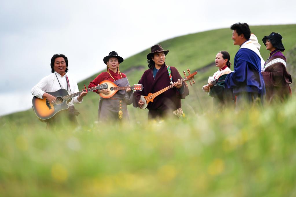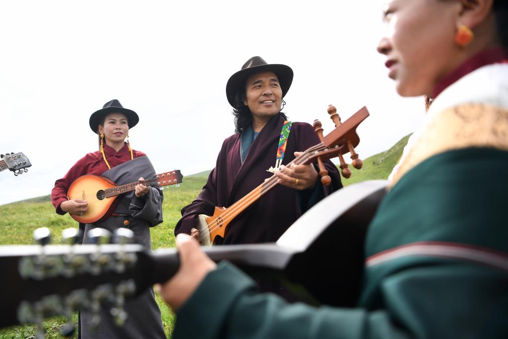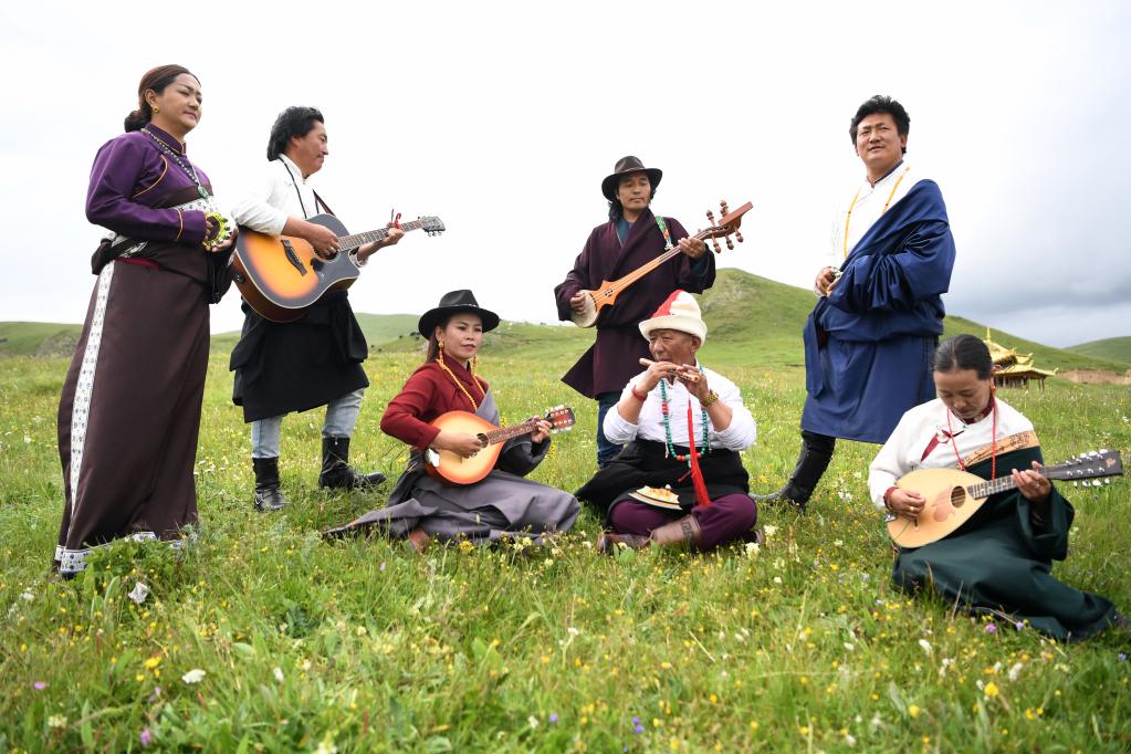 格萨尔弹唱艺人尕藏扎西(中)在玛曲草原上弹唱格萨尔(7月14日摄)。 盛夏季节,在海拔3000多米的甘肃省甘南藏族自治州玛曲草原上,格萨尔弹唱艺人们背着乐器,相约草原深处,用弹唱的方式诉说着格萨尔王的英雄故事,动听的格萨尔弹唱也成为夏日里草原上的“流行乐”。 玛曲县被誉为“格萨尔发祥地”,千百年来,在藏族民间弹唱艺人的传唱过程中,格萨尔王的故事被不断丰富,逐步汇成享誉世界的英雄史诗《格萨尔王》。格萨尔在2006年被列入首批国家级非物质文化遗产名录。 新华社记者 陈斌 摄