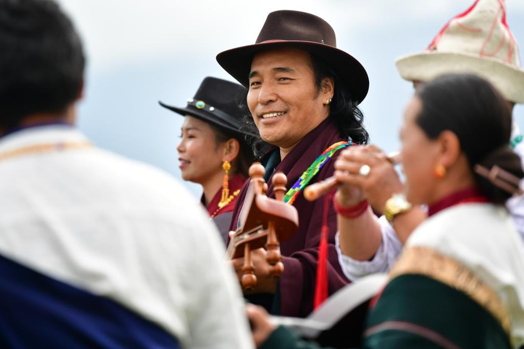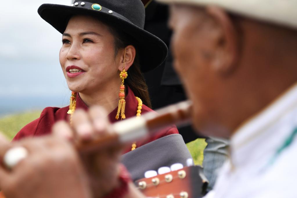 格萨尔弹唱艺人旦知吉(左)在玛曲草原上弹唱格萨尔(7月14日摄)。 盛夏季节,在海拔3000多米的甘肃省甘南藏族自治州玛曲草原上,格萨尔弹唱艺人们背着乐器,相约草原深处,用弹唱的方式诉说着格萨尔王的英雄故事,动听的格萨尔弹唱也成为夏日里草原上的“流行乐”。 玛曲县被誉为“格萨尔发祥地”,千百年来,在藏族民间弹唱艺人的传唱过程中,格萨尔王的故事被不断丰富,逐步汇成享誉世界的英雄史诗《格萨尔王》。格萨尔在2006年被列入首批国家级非物质文化遗产名录。 新华社记者 杜哲宇 摄