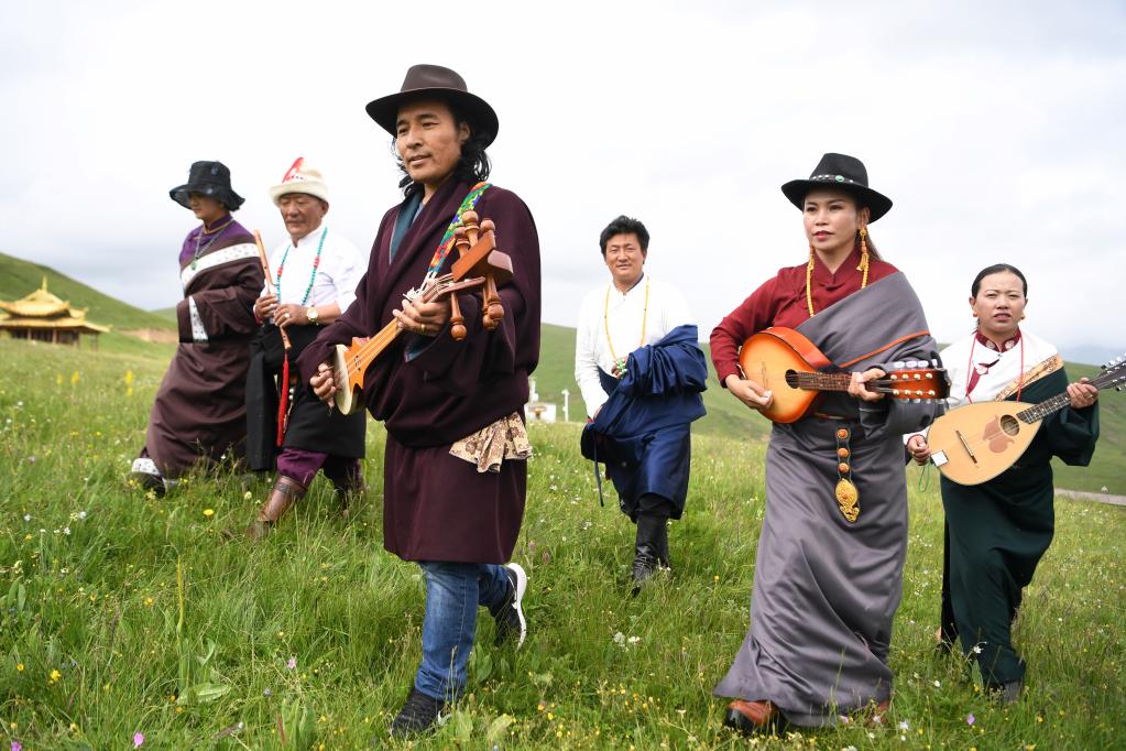 格萨尔弹唱艺人带着乐器走在玛曲草原上(7月14日摄)。 盛夏季节,在海拔3000多米的甘肃省甘南藏族自治州玛曲草原上,格萨尔弹唱艺人们背着乐器,相约草原深处,用弹唱的方式诉说着格萨尔王的英雄故事,动听的格萨尔弹唱也成为夏日里草原上的“流行乐”。 玛曲县被誉为“格萨尔发祥地”,千百年来,在藏族民间弹唱艺人的传唱过程中,格萨尔王的故事被不断丰富,逐步汇成享誉世界的英雄史诗《格萨尔王》。格萨尔在2006年被列入首批国家级非物质文化遗产名录。 新华社记者 陈斌 摄